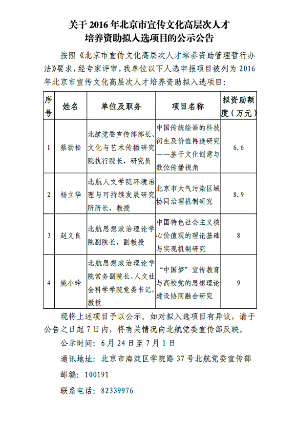 近日,按照《北京市宣传文化高层次人才培养资助管理暂行办法》要求,经专家评审,我院姚小玲教授、赵义良副院长等2位教师申报的项目被列为2016年北京市宣传文化高层次人才培养资助拟入选项目,据悉,我校共4位教师获批受资助,我院占2位。