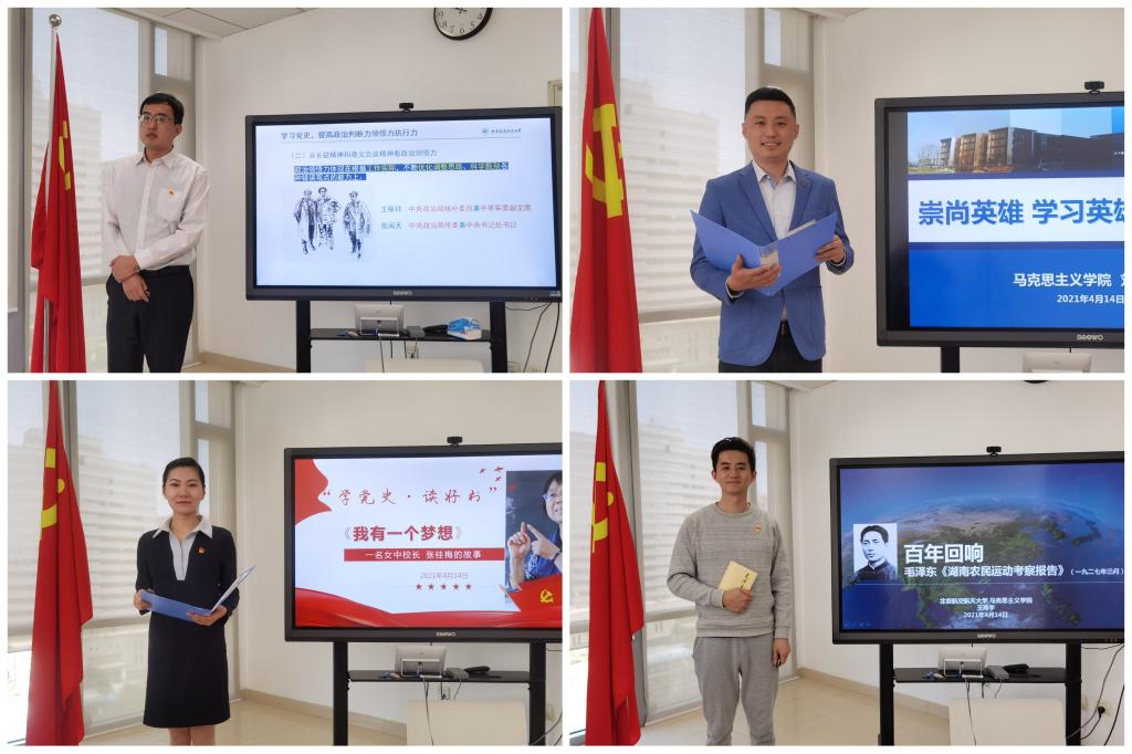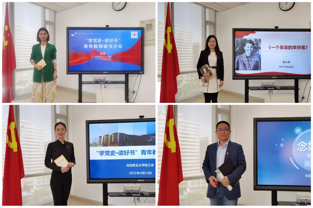 读书沙龙分两场举行,由欧美日一区工会主席陈萌老师主持。在4月7日的首场读书沙龙上,孙润南、赵华珺、徐冶琼、陈丹、宋芳芳老师分享了长征路上徐解秀老人与三个女红军战士之间“半条被子”的感人故事、烈士史砚芬充满牺牲精神和深沉爱意的诀别家书、毛泽东同志《关心群众生活 注意工作方法》的节选片段、小说《红岩》中的精彩片段以及赵觉和赵云霄这对革命伉俪的两封感人至深的遗书。在4月14日的第二场读书沙龙上,孙新、刘浩然、申文昊、王海宇、张静、雷小苗、吴东姣、曹镇玺老师分享了《在党史学习教育动员大会上的讲话》,小说《高山下的花环》,全国脱贫攻坚楷模、华坪女高校长张桂梅事迹,毛泽东同志《湖南农民运动考察报告》、《实践论》与《习近平与大学生朋友们》节选,《一个革命的幸存者•曾志回忆录》,刘少奇同志《论共产党员的修养》,习近平总书记的词《念奴娇·追思焦裕禄》等,内容丰富,形式多样。