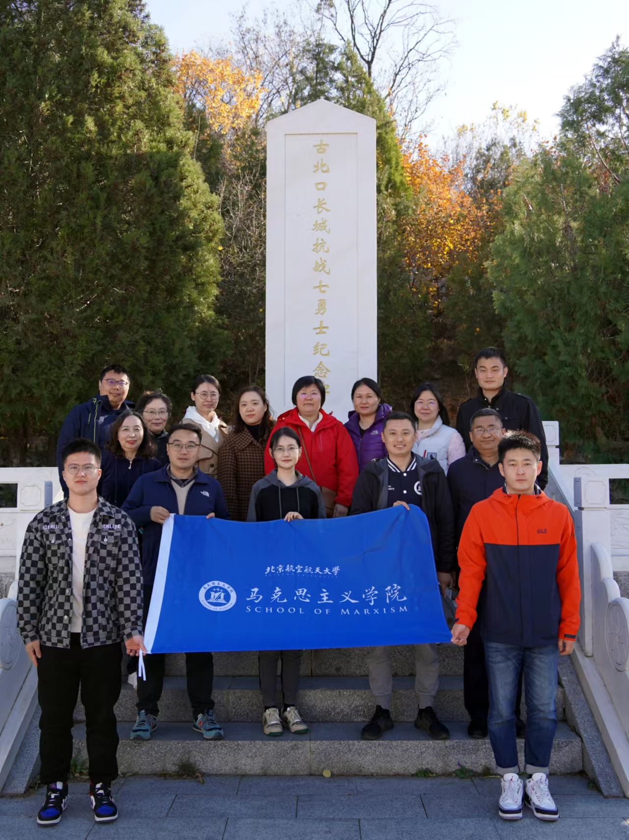 学院教职工首先来到古北口抗日保卫战阵亡烈士纪念碑。纲要教研部教师为大家讲述了87年前那段惊天地泣鬼神的抗战历史。“九一八”事变后,日军迅速占领了东北三省,1933年3月,中日两国军队在长城内外展开了一场旷日持久的绞杀战,7名中国勇士为了掩护部队转移,孤军阻击日军的猖狂进攻,至死都未曾退却。