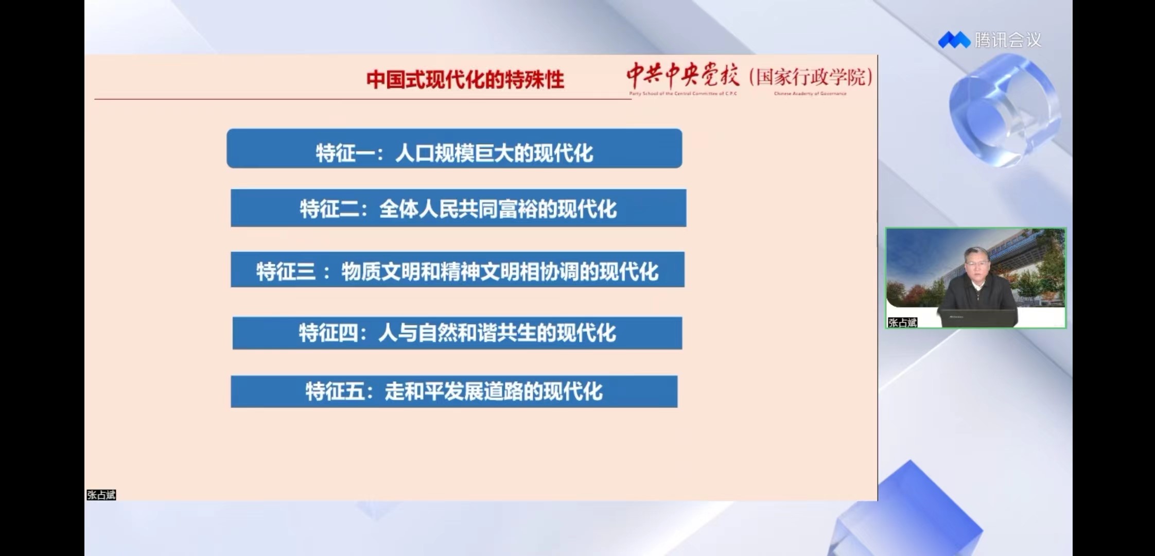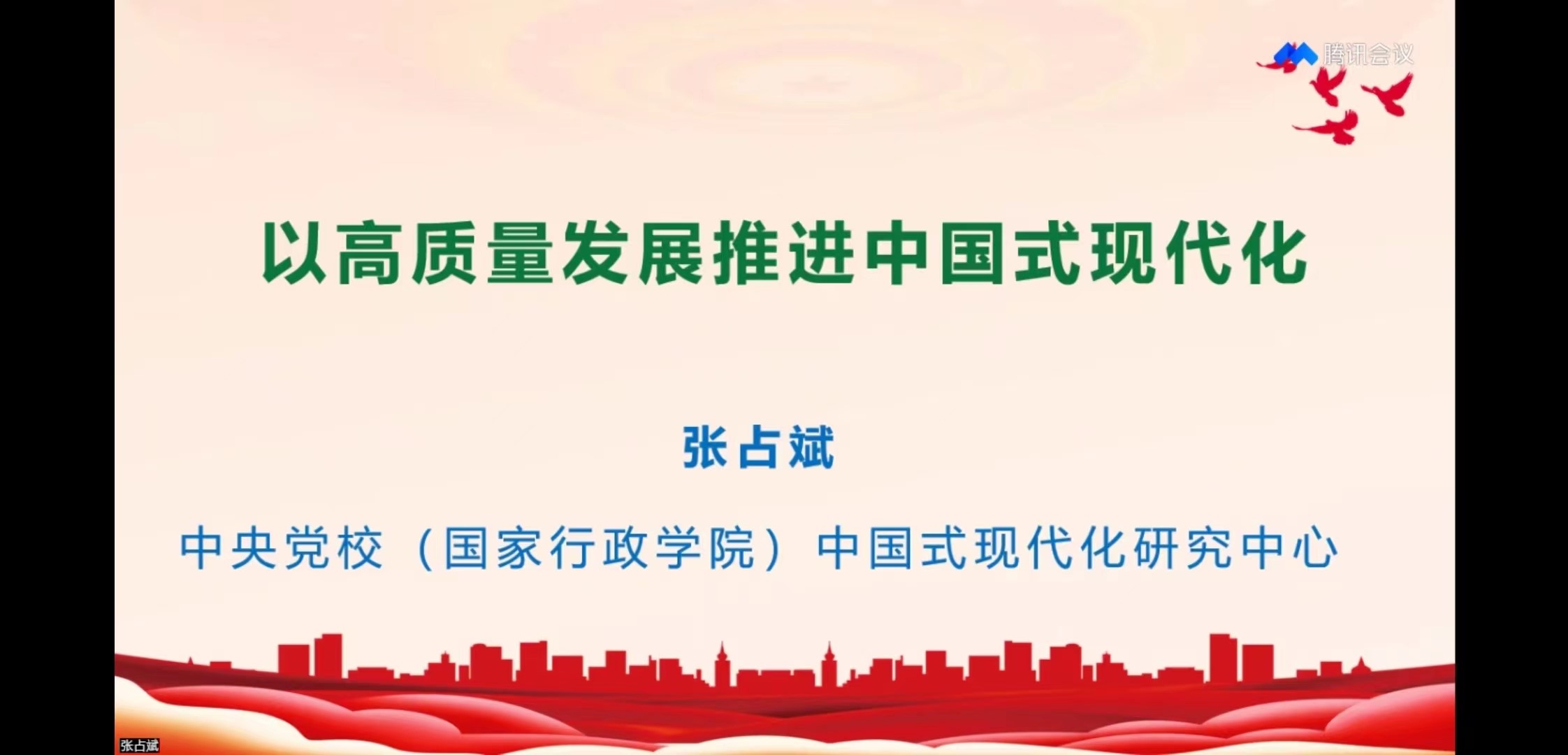 2023年12月20日上午,欧美日一区邀请中共中央党校(国家行政学院)中国式现代化研究中心主任张占斌教授走进我校思政课课堂,作《以高质量发展推进中国式现代化》专题报告。报告采取“腾讯会议+直播”的形式进行,我校2021级、2022级和2023级本科生、马克思主义学院部分师生共同聆听报告。欧美日一区党委书记高宁主持报告会。