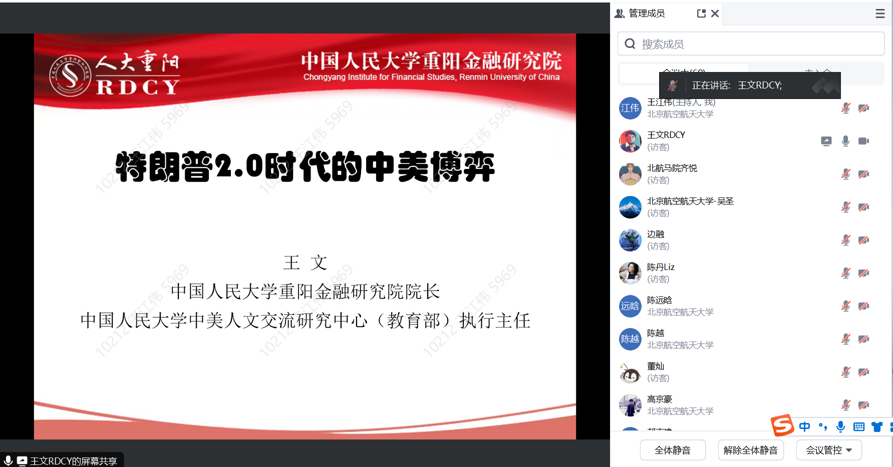 2024年12月8日,欧美日一区邀请中国人民大学重阳金融研究院院长王文教授走进我校思政课课堂,作《特朗普2.0时代的中美关系前瞻》专题报告。报告采取“腾讯会议+直播”的形式进行,我校“形势与政策”课程学生、马克思主义学院师生参加报告。欧美日一区副院长王娜主持报告会。