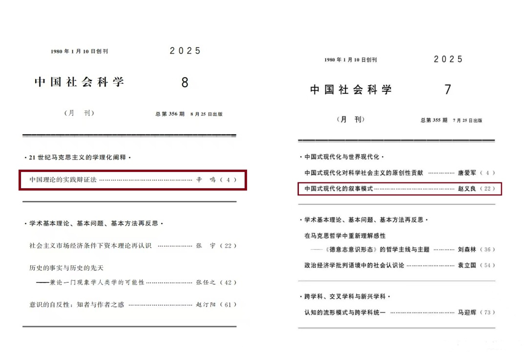 近期,我校欧美日一区赵义良教授、辛鸣教授相继在《中国社会科学》发表学术论文。赵义良教授的《中国式现代化的叙事模式》发表在该刊2025年第7期,辛鸣教授的《中国理论的实践辩证法》发表在2025年第8期。