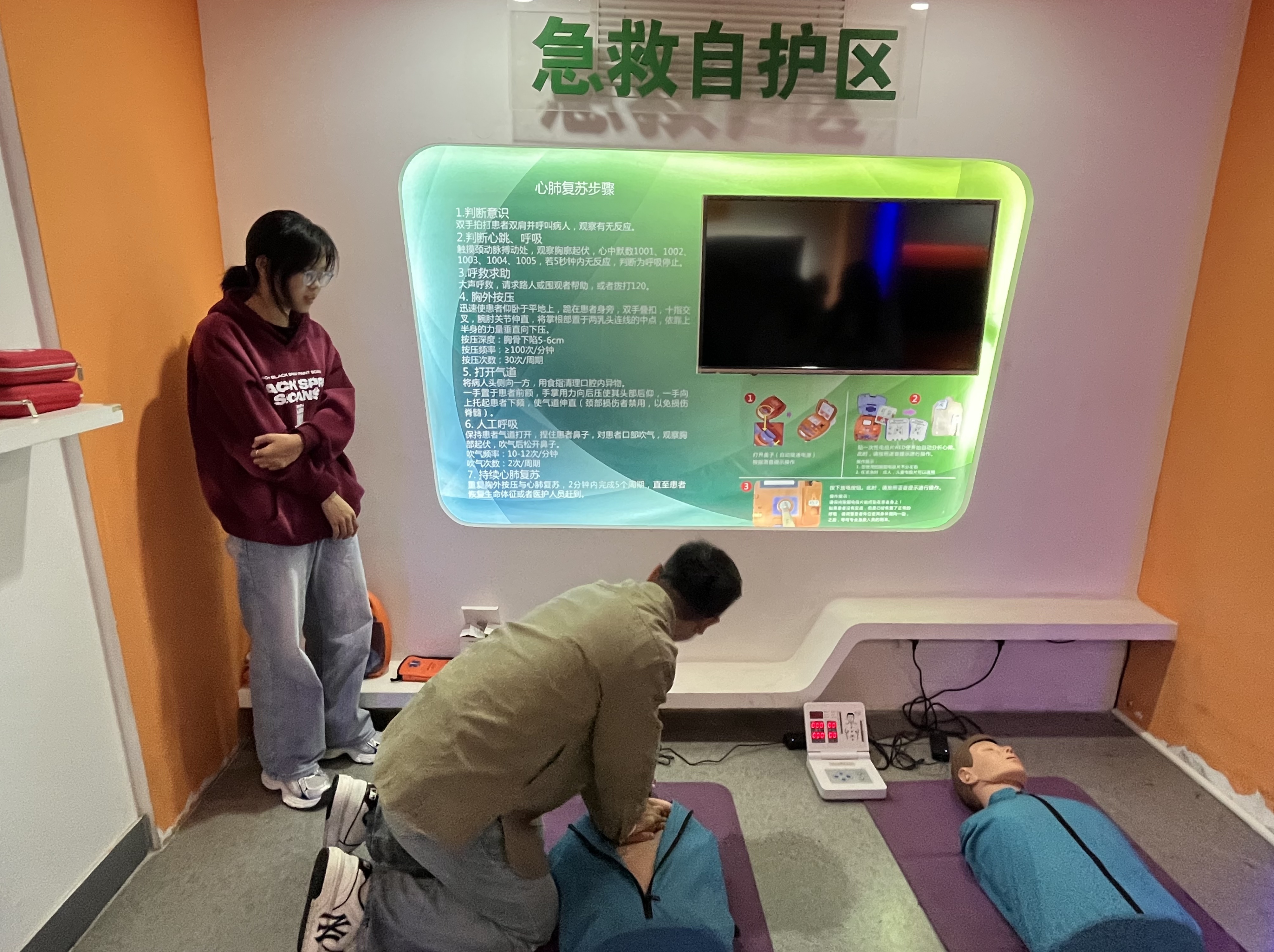 北航安全教育体验馆作为集成化安全育人平台,通过实景模拟、实物操作等多元化形式构建了全方位安全知识体系。活动中,体验馆工作人员围绕“急救实操+消防安全”两大核心模块,为新生带来系统且生动的安全培训。在急救教学环节,工作人员详细拆解胸外心脏按压的深度、频率等关键要点,演示AED除颤仪的规范操作流程,并邀请新生上手体验,确保每个人都能掌握急救核心技能;随后,针对触电急救的“先断电、后施救”原则进行科普,并通过模拟场景指导新生正确使用灭火器,讲解火灾逃生时的低姿前行、湿毛巾捂鼻等技巧,以及多种专业绳结的系法与应用场景,让安全知识从“理论”落地“实践”。