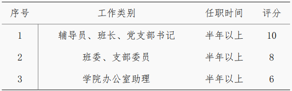 b. 社会工作得分由学院研究生工作办公室按下表计核定,同时兼任多职者分数可累计。