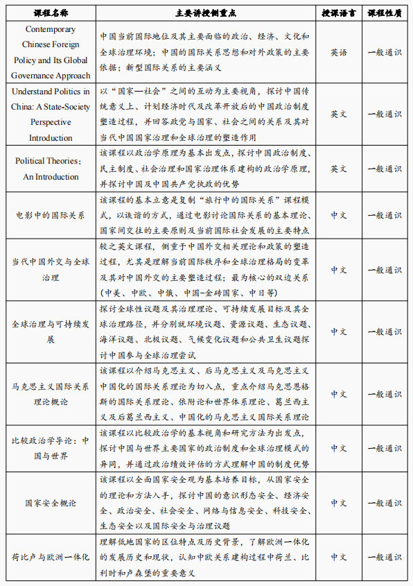 基于该研究平台,中心承担欧美日一区硕士、博士专业英语课,并已依据中心研究员的不同专业背景建构国际问题研究类思想政治通识课(其中全英文课程3门),具体如下:
